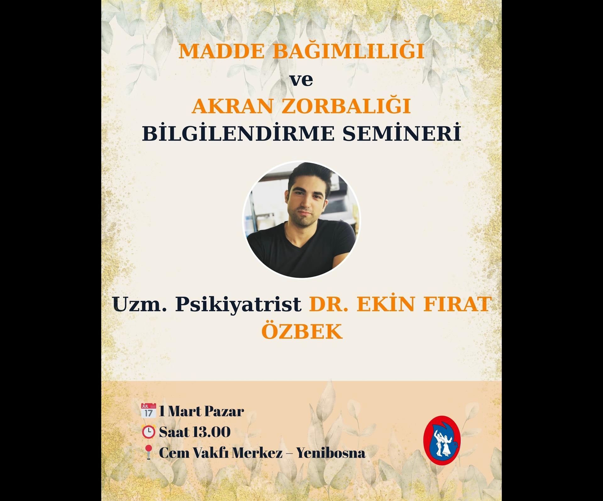 Uzm. Psikiyatrist Dr. Ekin Fırat Özbek’in katılımıyla gerçekleştireceğimiz bilgilendirme seminerinde; madde bağımlılığı, akran zorbalığı, korunma yolları ve psikolojik destek süreçleri ele alınacaktır.