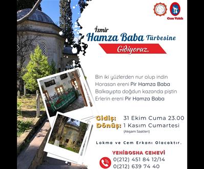 Canlar, Yolumuzun ulularından Hamza Baba’yı ziyaret etmek, huzurunda niyaz olmak ve birliğimizin lokmasını paylaşmak için canlarımızla birlikte İzmir’e Hamza Baba Türbesi’ne yola çıkıyoruz. Bu kutlu yolculukta, Hak aşkıyla bir araya gelecek; lokmamızı paylaşıp, Cem ibadetimizi gerçekleştireceğiz. ...