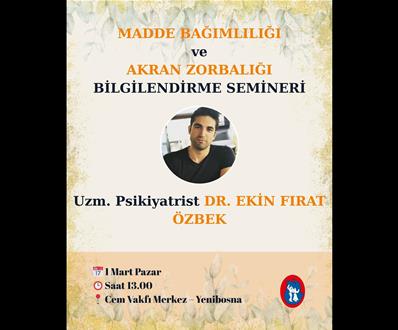 Madde bağımlılığı ve akran zorbalığı, gençlerimizin ve ailelerimizin karşı karşıya kaldığı önemli sorunlar arasında yer alıyor. Bilinçlenmek, erken fark etmek ve doğru adımlar atabilmek için bir araya geliyoruz. Uzm. Psikiyatrist Dr. Ekin Fırat Özbek’in katılımıyla gerçekleştireceğimiz bilgilendirme seminerind ...