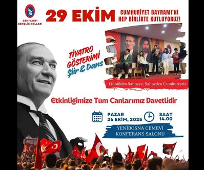 Gençlik Kollarımızın Düzenlediği "29 Ekim Cumhuriyet Bayramı Etkinliğine" Tüm halkımız davetlidir. Yer: Cem Vakfı Genel Merkezi Pazar Saat 19.30'da