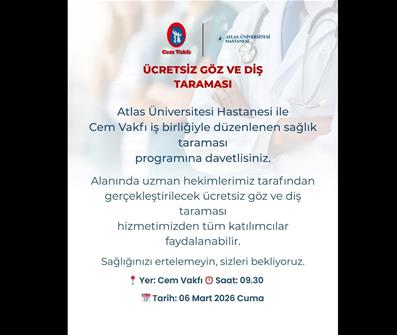 Atlas Üniversitesi Hastanesi ile Cem Vakfı iş birliğinde düzenlenen sağlık taraması programına davetlisiniz. Alanında uzman hekimler tarafından gerçekleştirilecek ücretsiz göz ve diş taraması hizmetinden tüm halkımız faydalanabilir. Tarama programı, Cem Vakfı Yenibosna Cemevi’nde gerçekleştirilecektir. & ...