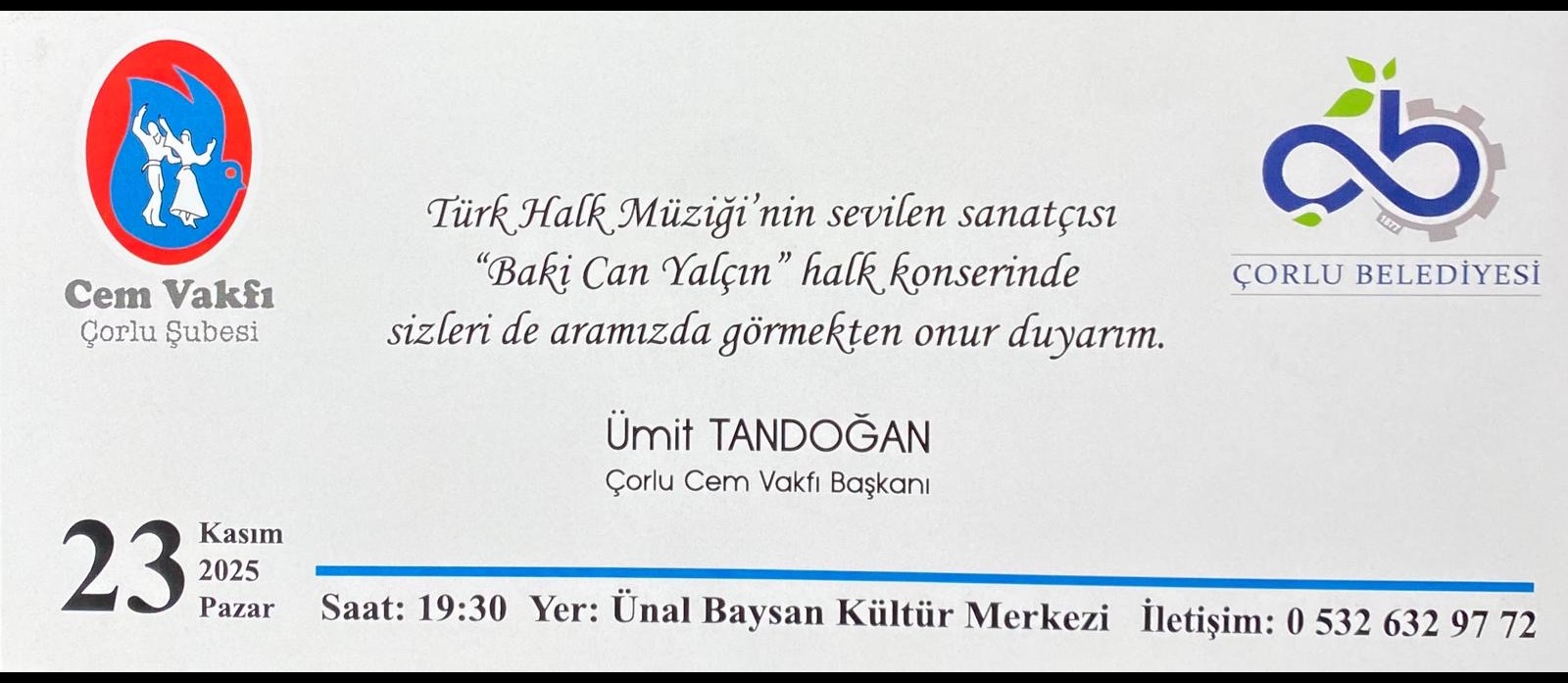 Çorlu Cem Vakfı Şubemiz tarafından düzenlenen, Türk Halk Müziği’nin sevilen sanatçısı Baki Can Yalçın halk konserine tüm halkımız davetlidir. Birlik, muhabbet dolu bu güzel akşamda sizleri de aramızda görmekten onur duyarız. CEM VAKFI GENEL MERKEZİ