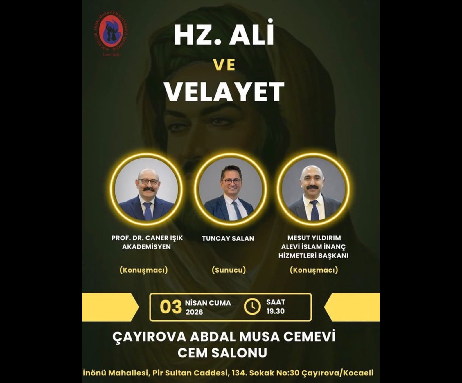Cem Vakfı olarak, 03 Nisan 2026 Cuma günü saat 19.30’da, Kocaeli Çayırova Abdal Musa Cemevi Cem Salonu’nda düzenleyeceğimiz “Hz. Ali ve Velayet” programımıza tüm canlarımız davetlidir.